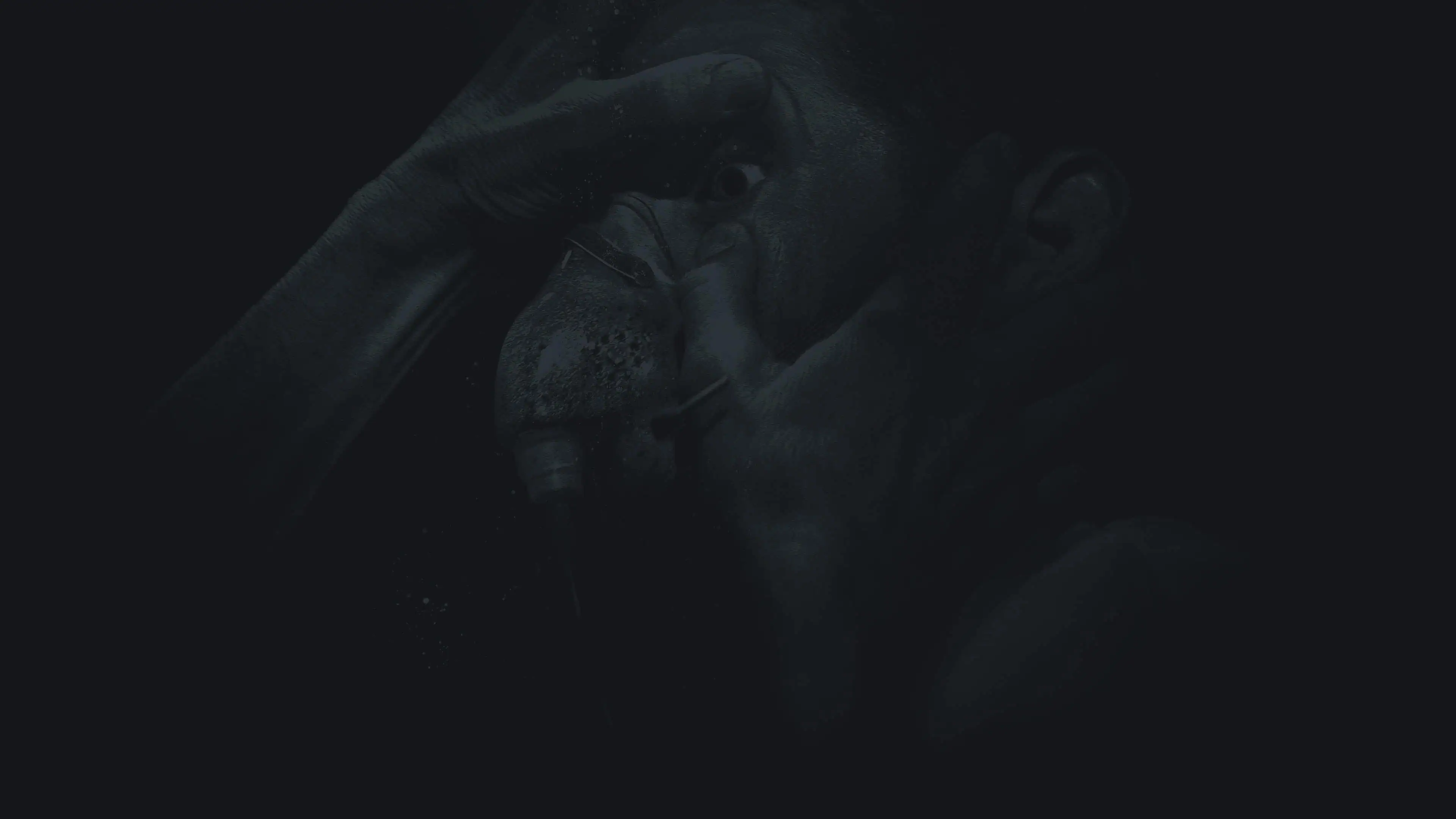 Lights turn on with a flashbulb-like burst, revealing animal remains in a trap, accompanied by a warped stinger.